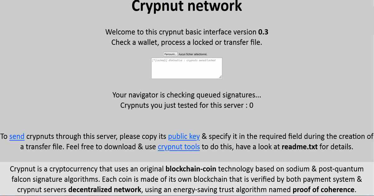 Crypnut is a cryptocurrency that uses an original blockchain-coin technology based on sodium & post-quantum falcon signature algorithms.